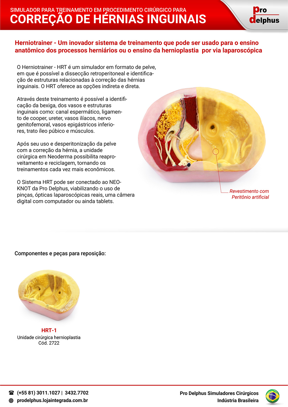 Composto por uma pelve com estruturas internas como bexiga, canal espermático ureter, nervos e vasos locais, recobertos por peritoneo. Possui ainda 02 hernias inguinais, 01 direta e outra contralateral direta. Permite dissecção peritoneal e aplicação de telas corretoras. Os precedimentos necessitam de equipamento de vídeo cirurgia epecíficos. De forma inovadora e com baixo custo o sistema Pro Delphus SMT viabiliza o uso da unidade cirúrgica de Herniorrafia com o simualdor realístico Neo-Knot da Pro Delphus para intervenções laparoscópicas.